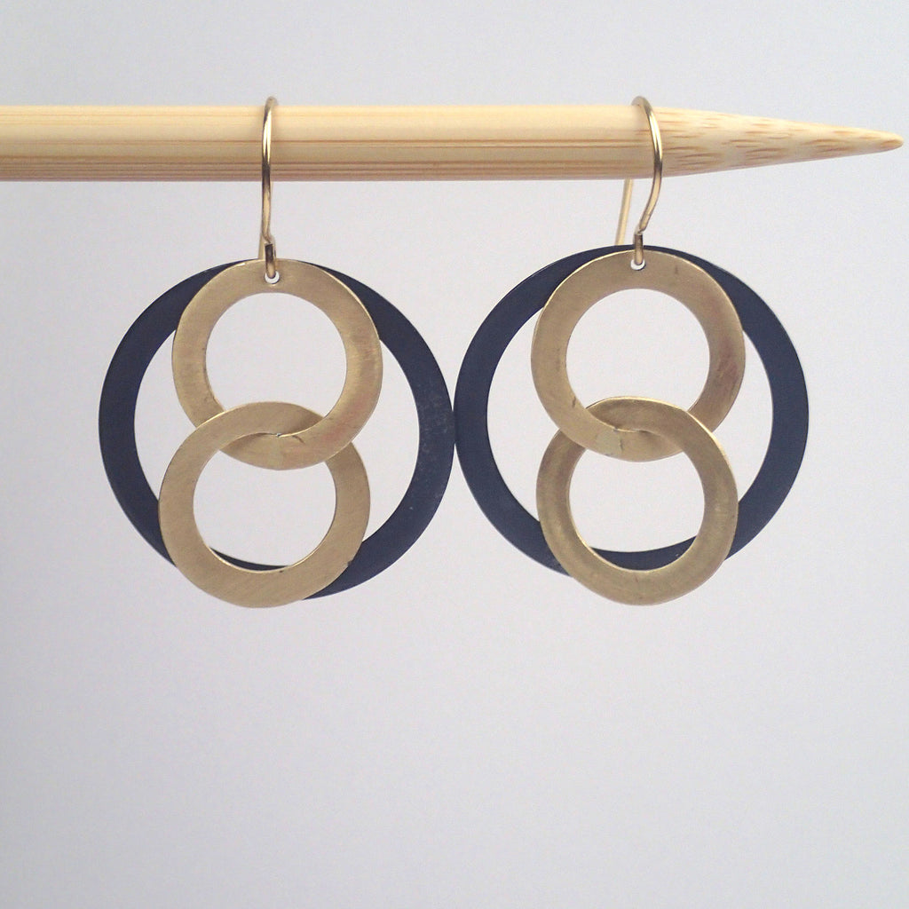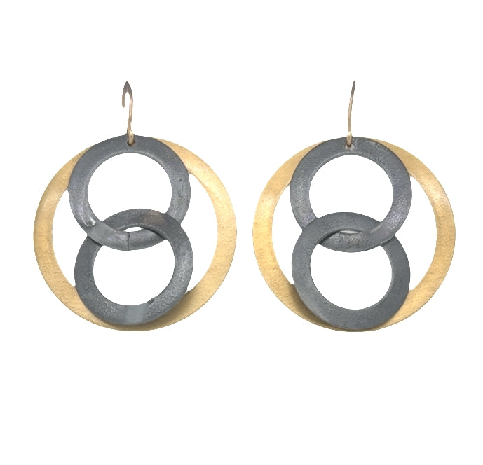 Two small matte Nugold Brass interlocking rings hanging in front of a large oxidized silver ring. Hand polished to a matte finish and treated with protective coating to prevent tarnishing.