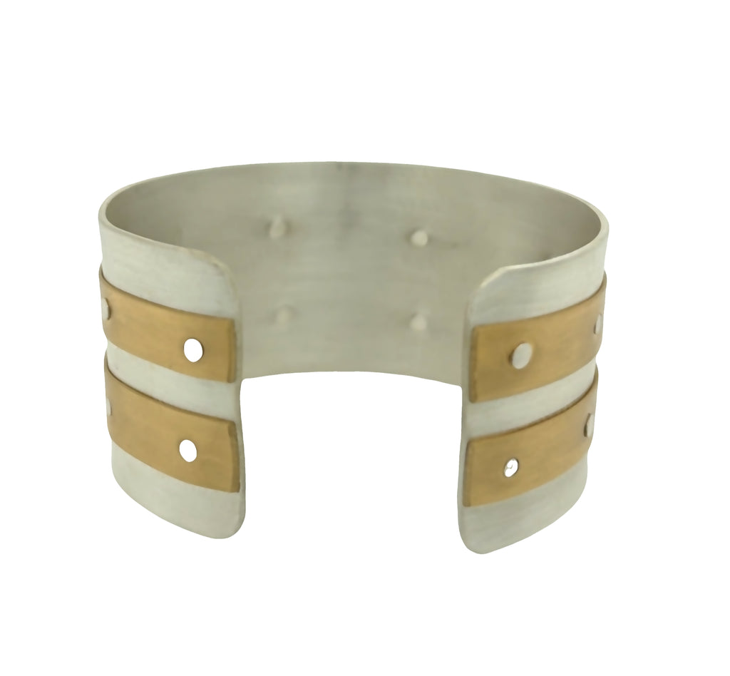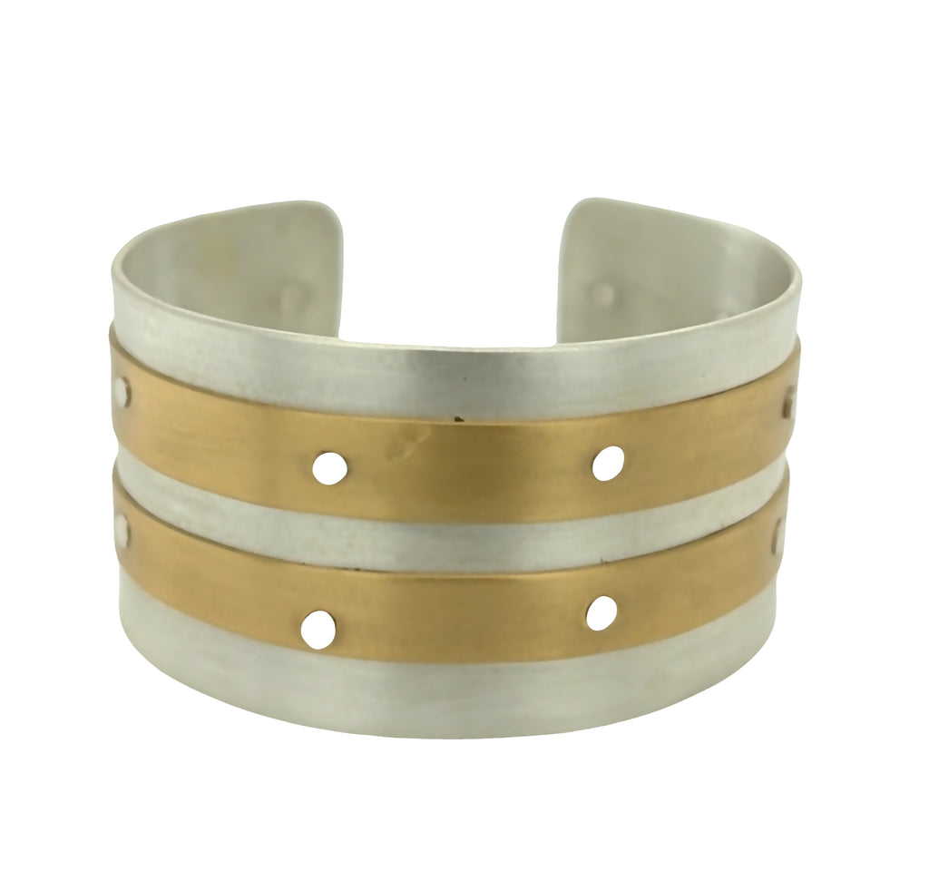 Handcrafted white copper cuff bracelet with two 1/4" Nugold brass strips riveted across lengthwise. Bracelet is 1 1/4" wide and 5 1/2" long. Bracelets can be custom ordered larger or smaller upon request. Cuff is treated with protective coating to prevent tarnishing. Each bracelet is handmade to order so there will be slight variations in the individual pieces.